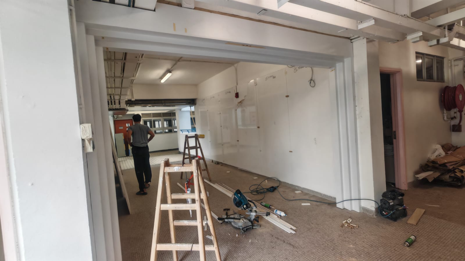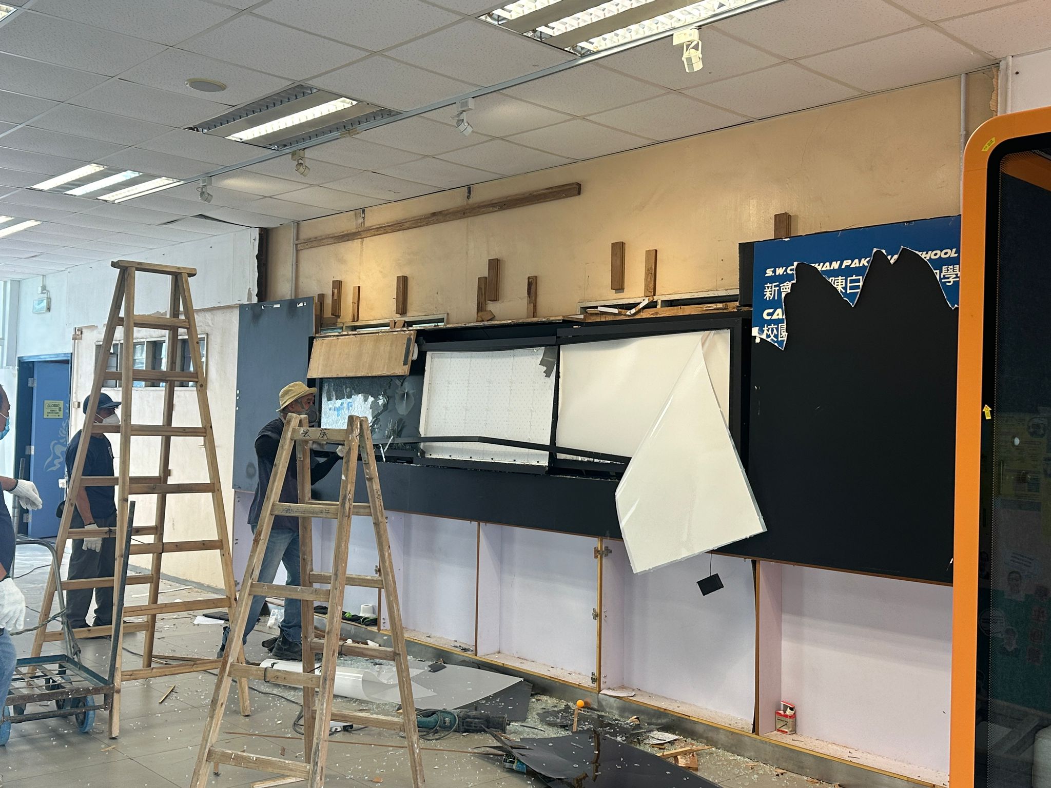 在走廊展示牆翻新方面,校方以「實用、清晰、易維護」為優先,BW亦貼心根據校方預算提供多個可行參考意見及方案比較,協助校方在成本與效果之間作出最合適取捨,最終選定理想的落地方案:展示牆採用上下白色油漆作乾淨背景,中間展示面以普通膠板處理,既方便日後更換作品、亦易於清潔保養;牆邊配置「琉璃藝境」招牌作為識別點,讓走廊由一般通道升級為有主題、有記憶點的校園作品展廊。施工階段,BW除跟進進度與品質外,亦認真監督現場工序,並為牆身做好保護措施,避免其他工程師傅施工期間碰撞刮花,確保完工效果與耐用度符合校方期望。